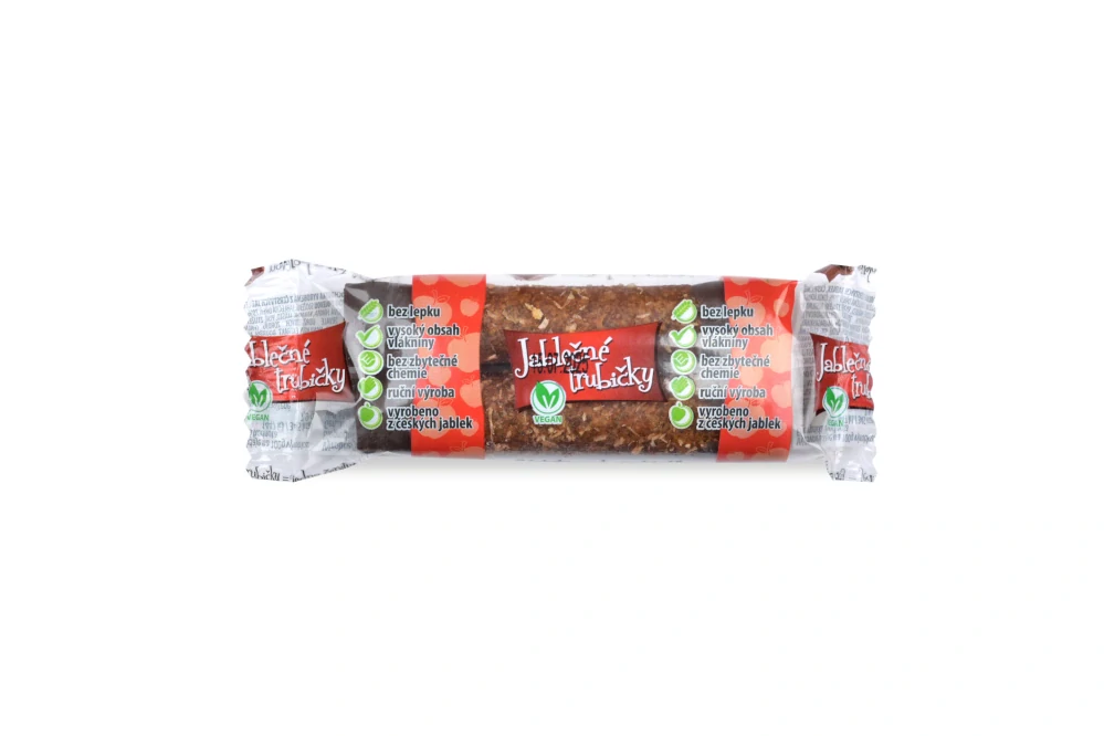 Jablečné trubičky s čokoládovou polevou z čerstvé jablečné dřeně bez lepku a konzervačních látek.