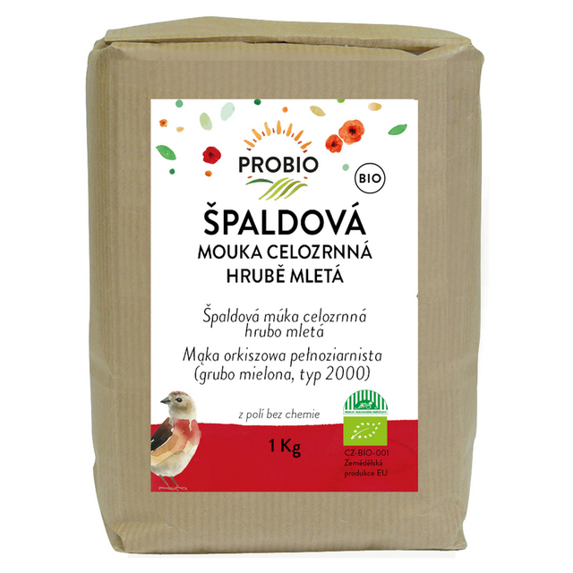 Mouka špaldová celozrnná hrubě mletá 1 kg BIO PROBIOskladem 2 ks62 Kč/ ks55 Kč bez DPH
